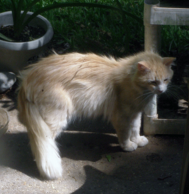 This is Mrs Curtis's cat that found her way to our house for a snack. She is a pretty cream or blond color. We have not seen her in a while now hope she is ok.